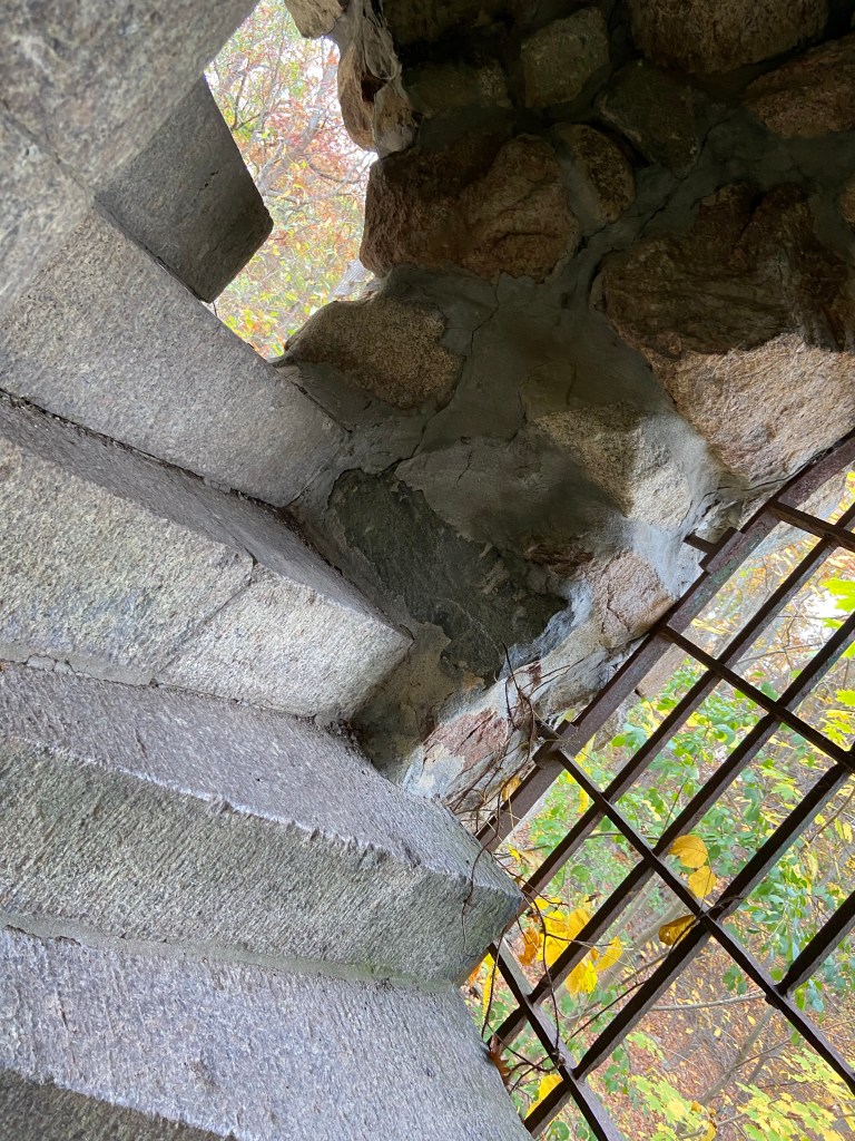 A stone tower erected in 1889 by Eben Norton Horsford, the structure is made of field stones, is almost 40 feet tall and contains a stone spiral staircase. And to our horror, its metal gated doorway was wide open.
