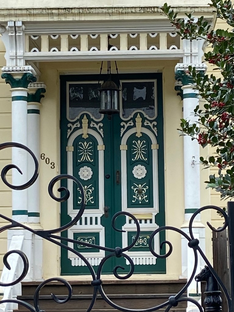 The facade of the house is largely unchanged since its build, and the home is said to have a fireplace in each room. But it’s the intricately carved front doors that made our hearts most happy.