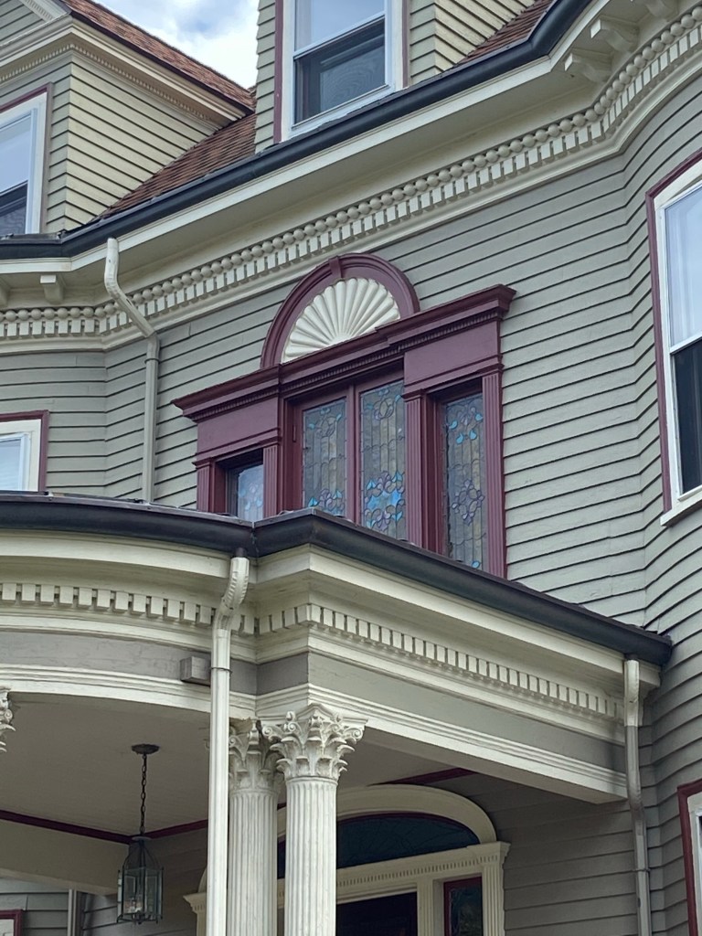 Located in the Newton Highlands Historic District, there are so many things to love about this beauty, but we are in love with the stained glass windows and trio of pediments up top.