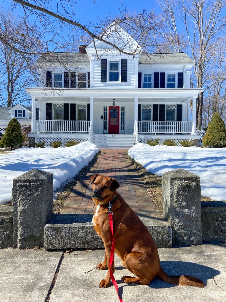 So lovely against this snow and blue skies, the Adams-Blake house is an 1850-built house in Bedford, Mass.