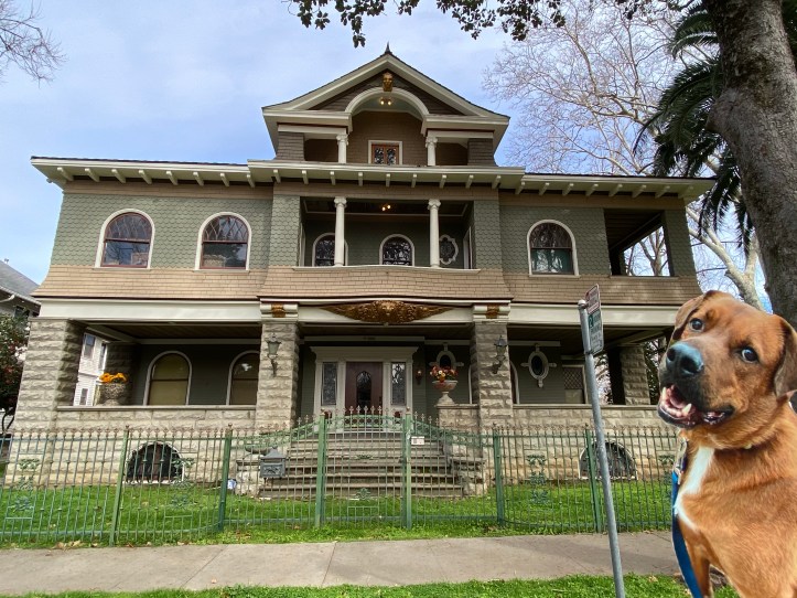 Built in 1907 for founder of Sutter Hospital, Dr. Aden C. Hart Colonial Revival-meets-Craftsman home has the most impressive lion detail to greet you over the porch.