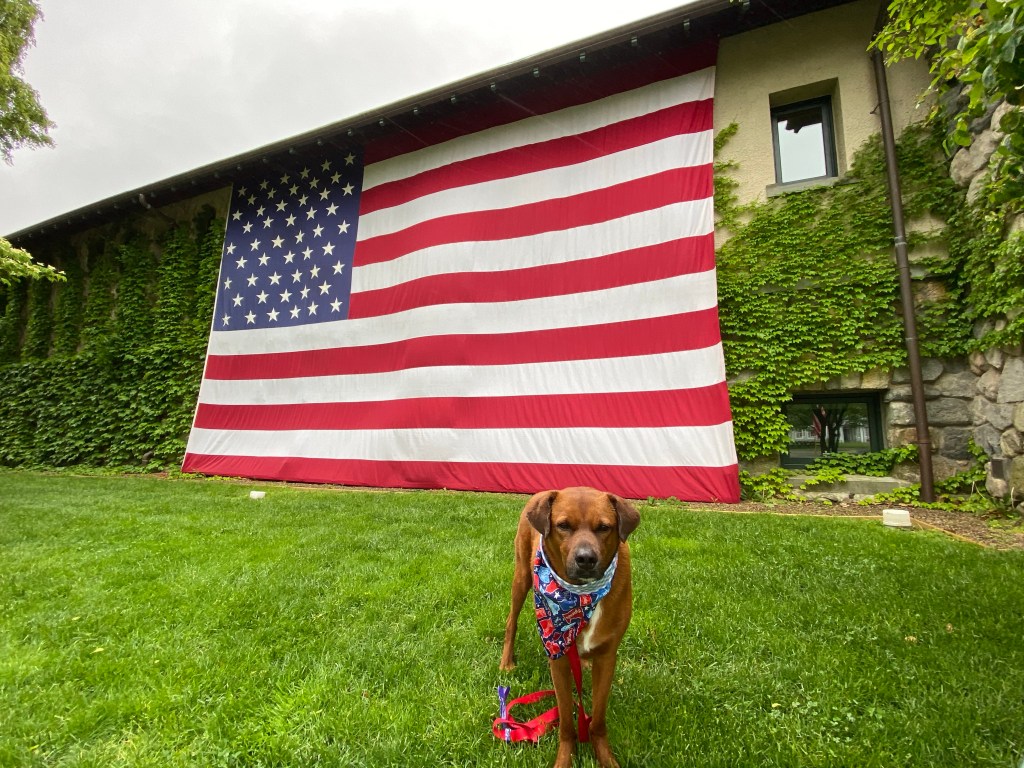 One thing we love about the Cary Memorial Library in Lexington, Mass., is that it hangs this big, beautiful flag for patriotic holidays, including Memorial Day. Please excuse our pics — it was pouring rain when we stopped by.