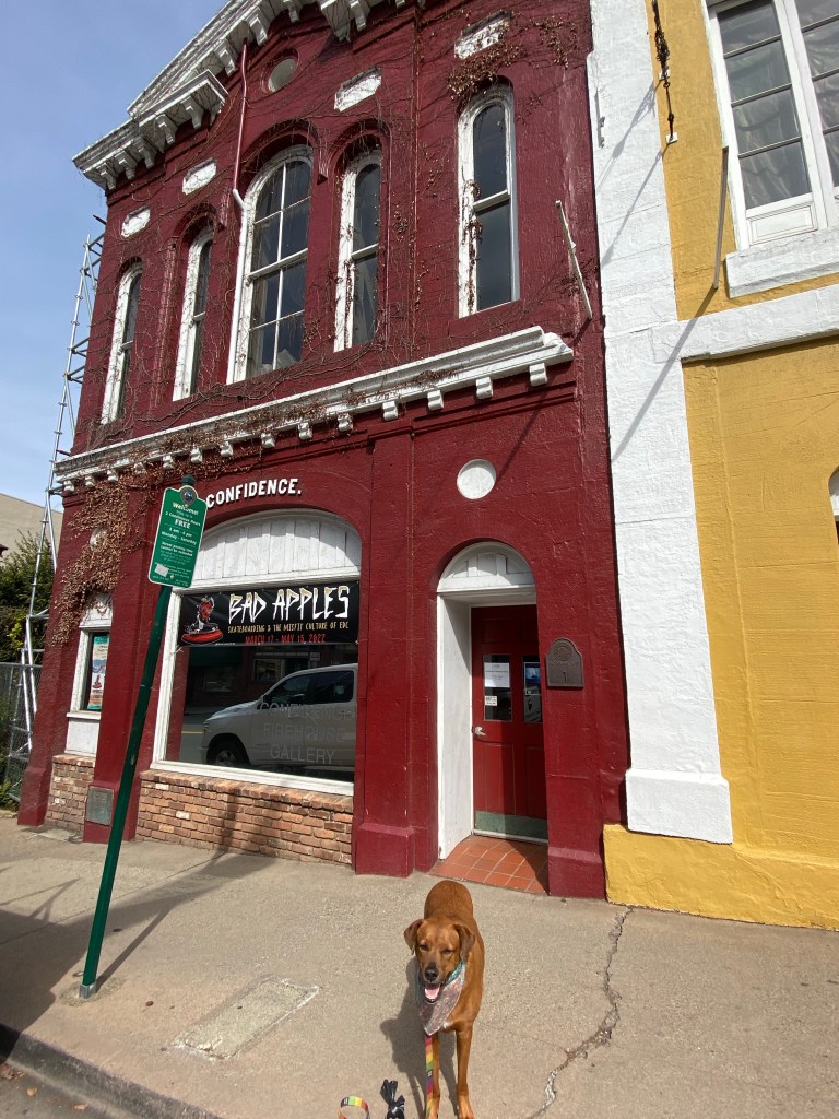 The red building sign reads: “This building was erected in the fall of 1860 for Confidence Engine Company No. 1, organized in June, 1857. City Government located here since 1902.”